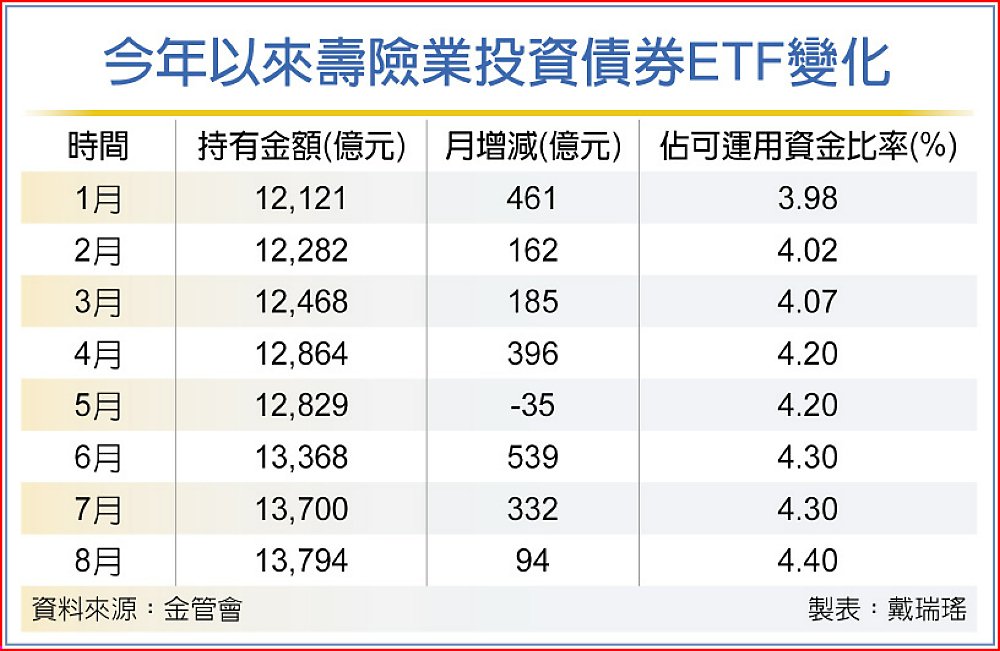 由於美國急速升息、台美利差擴大,傳統外匯避險工具費用大增,壽險業去年11月以來幾乎月月增持國內債券ETF,去年底持有金額為1兆1,660元,今年8月底持有金額已達1兆3,794億元,近期債券多為跌價,因此壽險債券ETF部位應為史上新高,近12個月內增加遠逾2,044億元或17%,光前八月就增持約2,134億元。