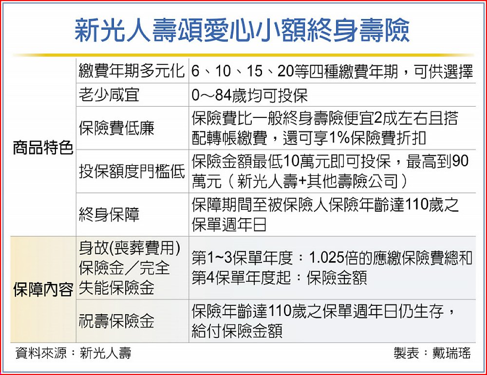 因應超高齡社會來臨,新光人壽推出「頌愛心小額終身壽險」,希望以此保險費親民及低投保門檻的高齡友善商品,提供樂齡族群基本保障,關懷長者補足保障缺口。因年紀漸長,投保常遇到體況及費率太高等問題,「頌愛心」最高投保年齡到84歲,保費相對親民。以55歲女性投保20年期、保險金額30萬元為例,每年保險費1萬830元,等於每天一杯咖啡的錢,高齡族群也能以實惠保險費,終身享有身故、完全失能及祝壽保險金等三大保障,輕鬆滿足壽險保障規劃。