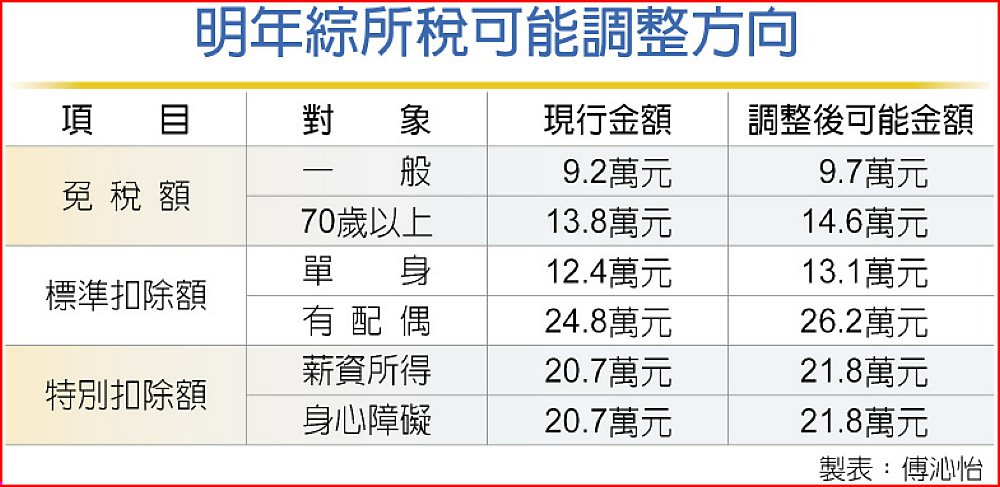 依照主計處公布的9月物價推估,明年綜所稅免稅額可望調高5,000元至9.7萬元,標準扣除額調高7,000元至13.1萬元;薪資所得及身心障礙特別扣除額分別調高1.1萬元至22.8萬元,綜所稅課稅級距等也將調高。