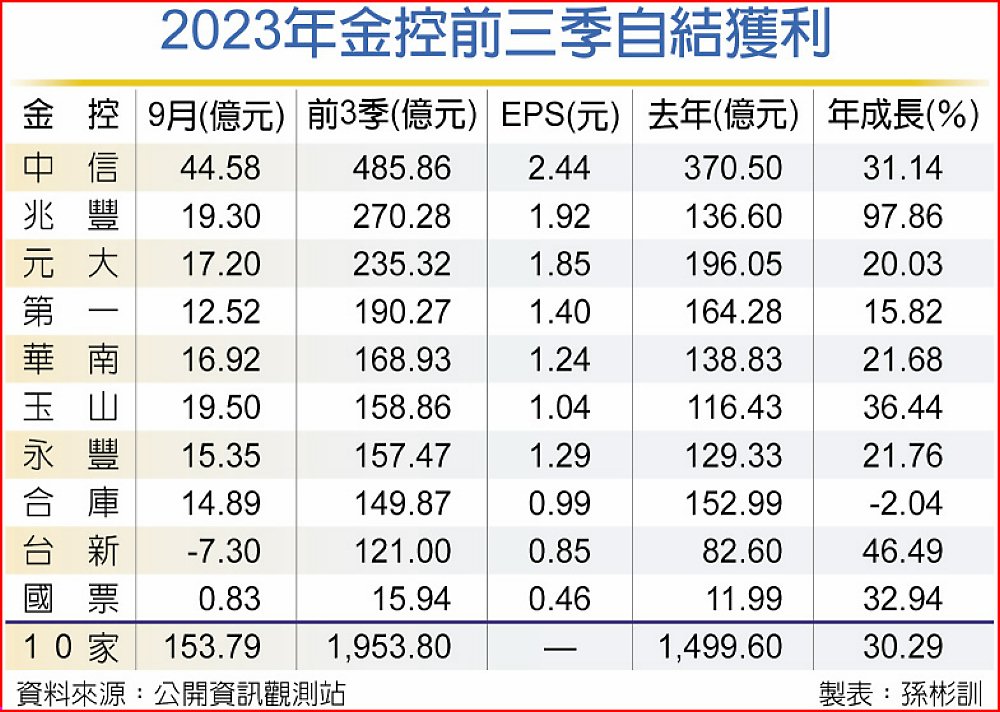 中信金前三季稅後賺485.86億元暫居第一,兆豐金以270.28億元緊追在後。10家金控有三家獲利逾200億元,另外有六家獲利逾百億元。