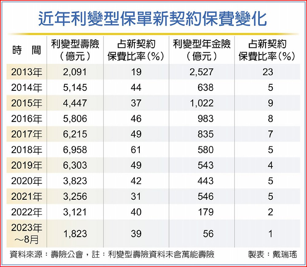 如銀行通路去年前八月銷售保單業績達3,003億元,其中約有近半是利變保單,今年前八月銀行通路保單業績僅1,684億元,衰退近44%。