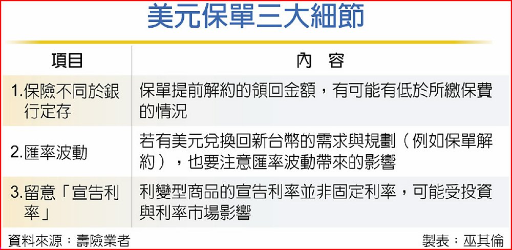 國壽也提到,現行市場偏好的美元利變型保單,除了過往常見之以保價累積增值為主要訴求,近幾年逐漸朝向提高身故保障甚至健康照護之設計,亦大受市場歡迎,同樣是民眾可參考的選項之一。