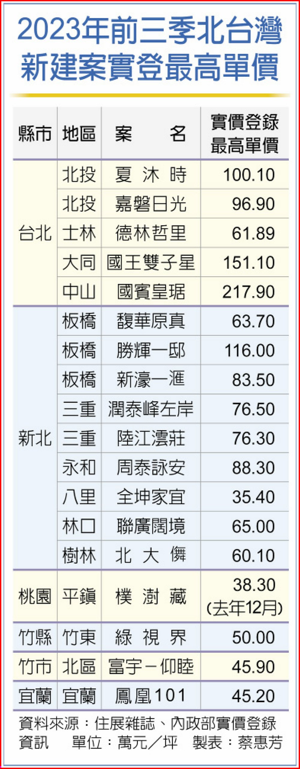 2023年前三季北台灣新建案實登最高單價