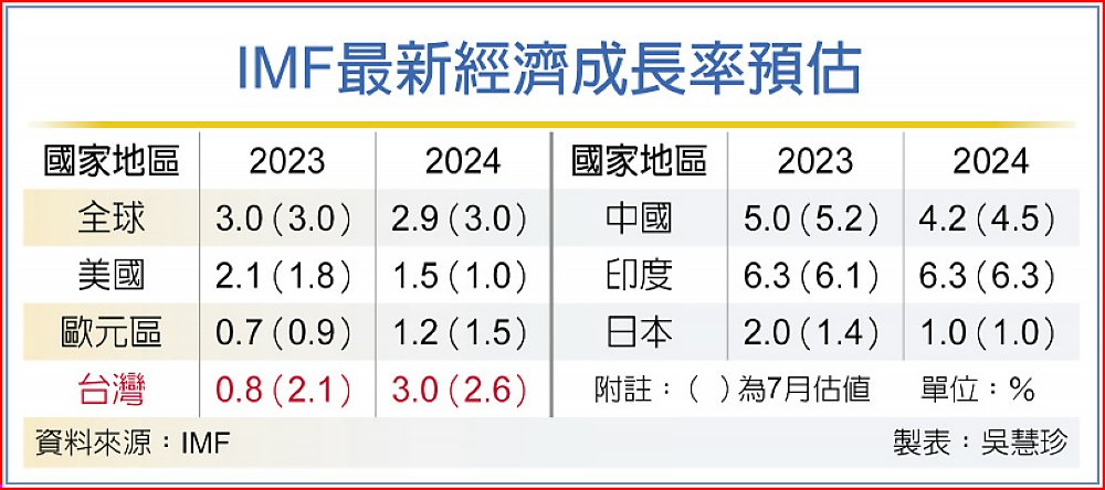 IMF預估台灣今年經濟成長率0.8%,與4月報告估值2.1%相比,大砍1.3個百分點。但IMF看好台灣明年成長前景,由4月預估的2.6%調高到3%。IMF同時預測台灣今年通膨率2.1%、明年1.5%,失業率今明年皆維持在3.7%。