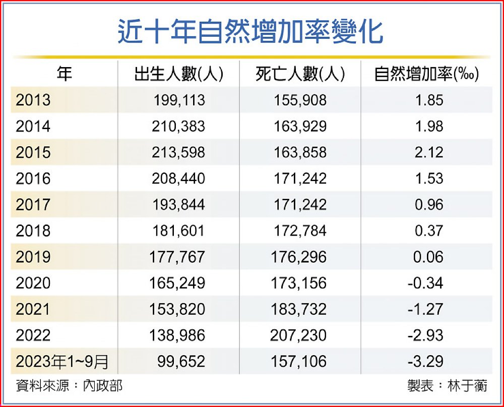 台灣從2020年正式進入「生不如死」的時代,2020年出生人數較死亡人數短少7,907人,2021年出生人數比死亡人數減少29,912人,2022年差距來到68,244人,至今年9月已連續33個月的出生人數都少於死亡人數,少子化國安危機嚴峻。