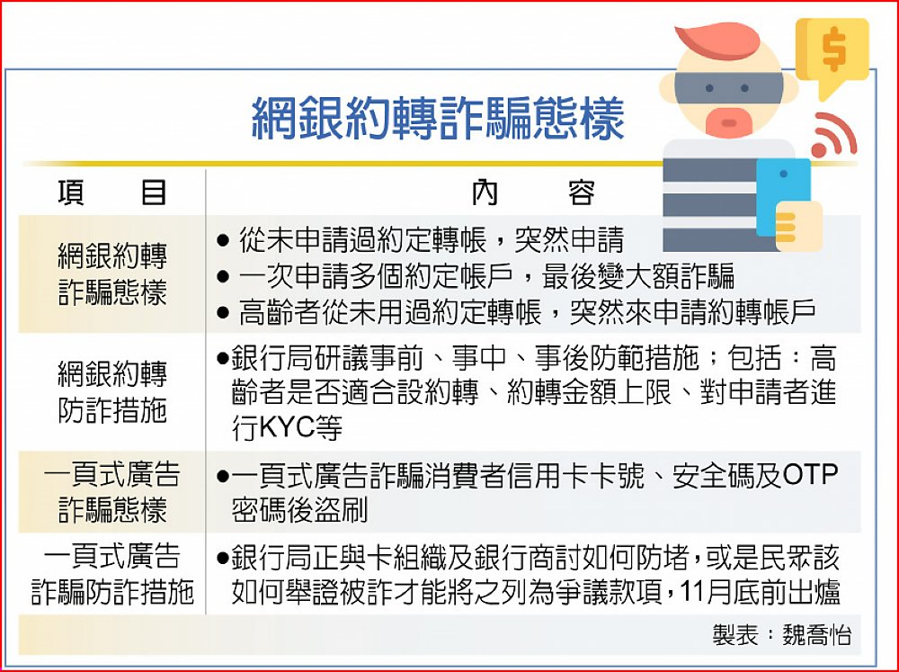 現已發現一些約定轉帳的詐騙態樣,一是從未申請過約定轉帳者,突然來申請約轉;二是一次申請多個約定帳戶,最後出現大額詐騙;三是有些高齡者從未使用過約定轉帳,卻突然一次申請多個約定帳戶,方便詐騙集團進行大額詐騙。黃天牧說,現在針對約定轉帳已在處理相關防範機制,會定出事前、事中、事後的措施,等有共識會再對外說明。