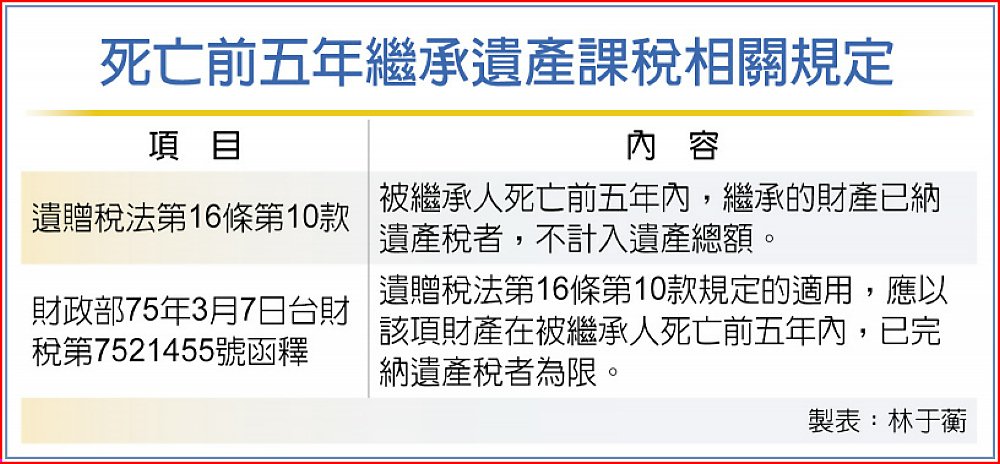換言之,國稅局將簡父死亡前五年內繼承簡母的遺產,併入簡男繼承簡父遺產總額課稅,並核定補徵遺產稅91萬餘元,並無違誤。