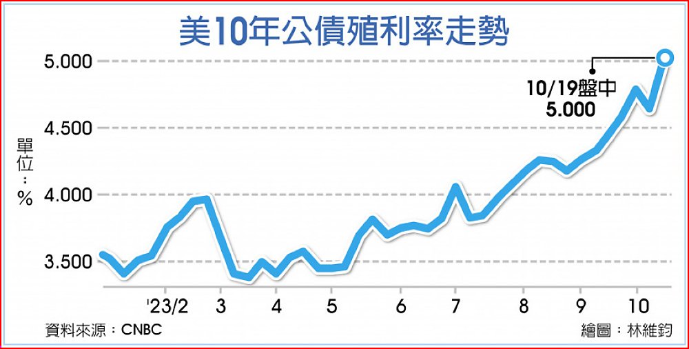 市場投資人持續消化鮑爾談話,20日亞洲盤時段,美國10年期公債殖利率一度觸抵5%,為2007年7月20日來首見,最後收在4.987%,刷新16年高點,稍晚10年期美債利率回跌到4.94%。