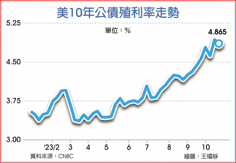 美國公債殖利率近幾周竄升,10年期公債債息本周稍早升破5%,創2007年以來的16年首見。利率位居高水位使長期政府債券、房貸、信用卡、車貸和商業貸款等借貸的成本大增,進而拖累美國消費力。