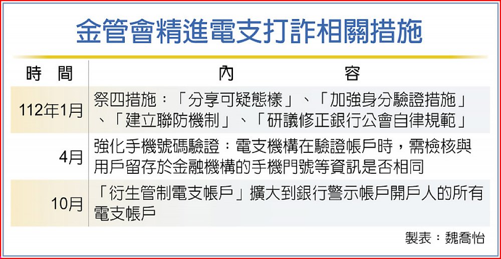 金管會年初時就開始與內政部警政署、銀行公會及電子支付機構等單位共同研究如何打詐,並祭出四大措施,包括:要求電支業者「分享可疑態樣」、「加強身分驗證措施」、「建立聯防機制」,並「研議修正銀行公會自律規範」等四項因應措施,以減少詐騙案件發生。