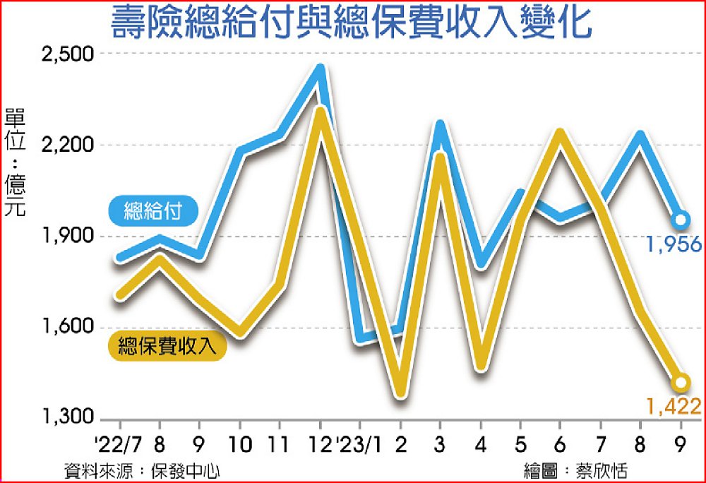 8月壽險總給付飆上2,232億元,9月總給付亦有1,956億元,連續兩個月總給付都大於總保費收入逾500億元,8月及9月壽險資金淨流出逾1,101億元,創同期新高,連兩月總給付占總保費比率都在130%以上。