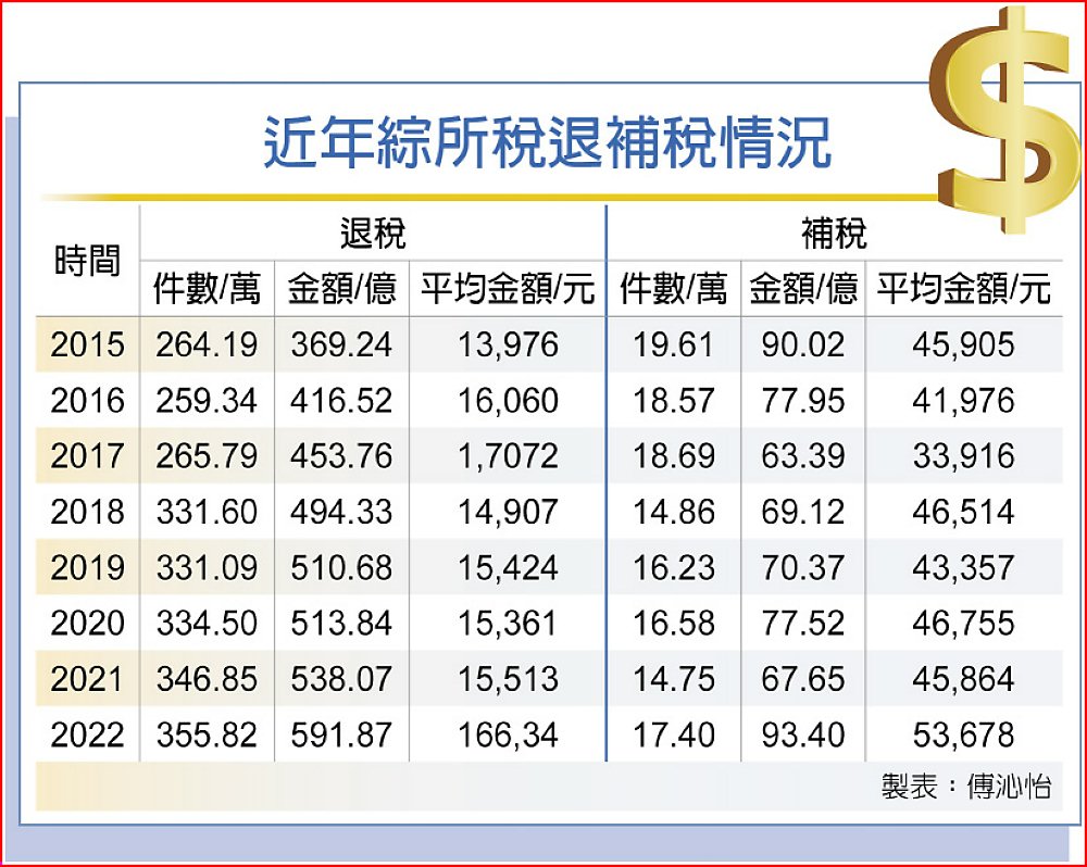根據財政部財政資訊中心最新統計,全台2022年度綜合所得稅有17.4萬戶申報戶需補稅,比前一年增加17.9%;至於合計補稅金額更大增38%至93.4億元,是近七年補稅金額首度再突破90億元。