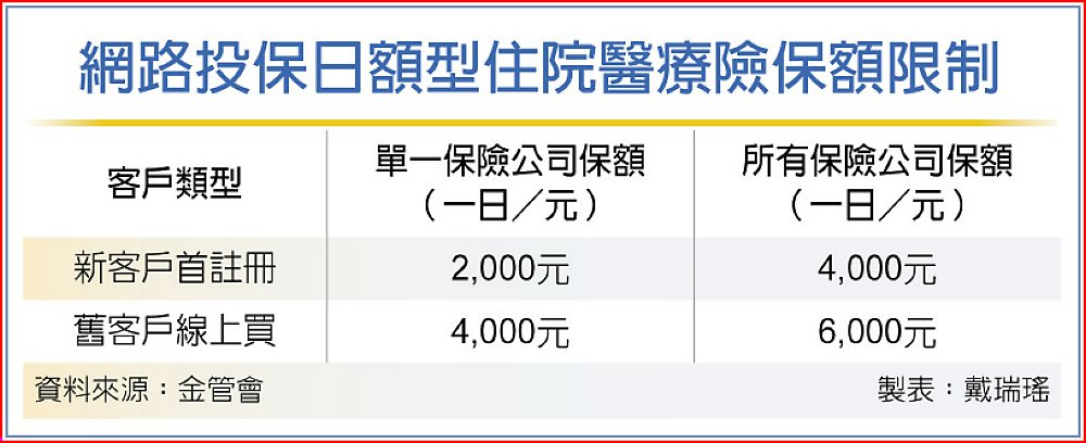 保險局去年9月底修正「保險業辦理電子商務應注意事項」,新增「日額型住院醫療健康保險」。但為防範道德風險及逆選擇發生,保險局同時有訂定網路投保日額型醫療險的保額限制,若是保險公司新客戶首次網路註冊投保,單一保險公司保額限日額2,000元,既有客戶單一公司保額最高日額4,000元。