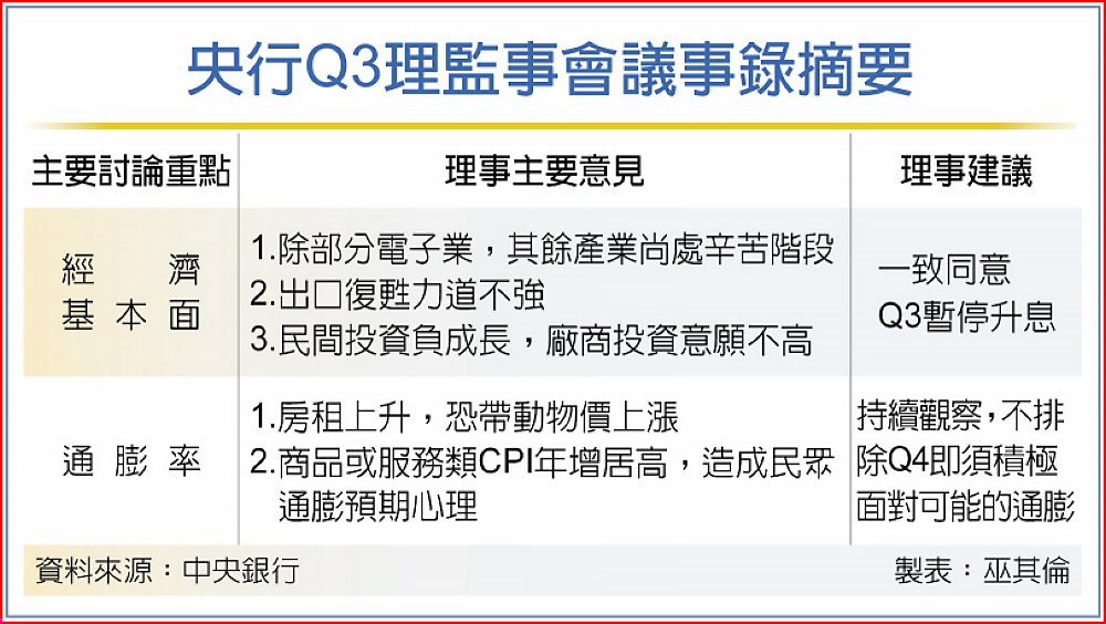 理事們考量當前經濟數據分歧,同意暫緩升息,建議再觀察一季,不排除下一季須積極面對可能的通膨。意即12月理監事會即可能要採取行動,降溫通膨。