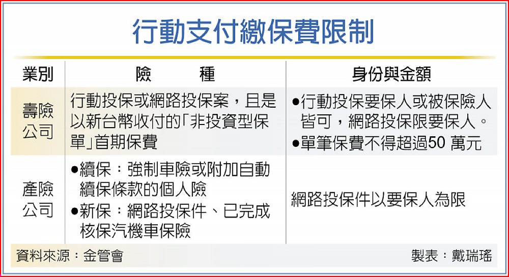 但民眾想用LINE Pay或Open錢包繳保費,有四大限制須留意,一是壽險公司保單限定為網路投保或行動投保的新台幣計價「非投資型保單」,且限制是首期保費;二是產險業可適用的保單,限強制車險續保,或附加自動續保條款的個人險續保保單,如果是新保的保單,僅限網路投保、已完成核保的汽機車保單,或有業務員提供繳款單的個人保單。