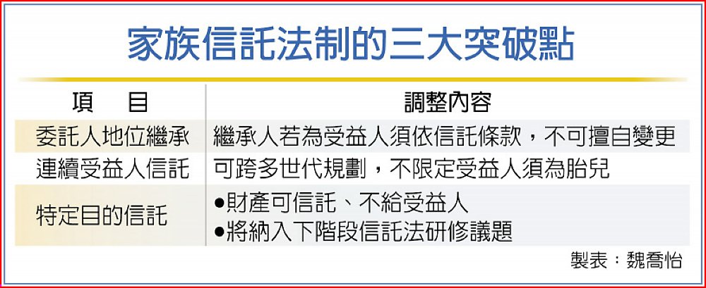 其中「委託人地位繼承」部分,過去法律解釋不明確,委託人死亡時,若受益人就是繼承人,繼承委託人地位,即可提前終止或變更信託契約,變賣家族企業股權,導致原本信託設立的目的無法達成。對此,法務部解釋除法條明定「委託人之繼承人」有此權利者外,原則上不得繼承。
