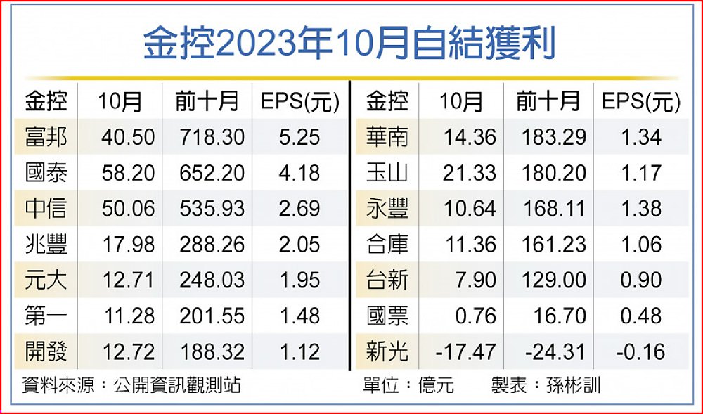 富邦金控10月因人壽子公司匯兌成本較高,金控單月稅後賺40.5億元,排名第三,但累計稅後獲利亦在10月破700億大關,達718.3億元、EPS為5.25元,都是金控第一名。
