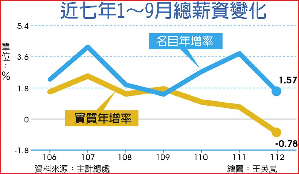 國勢普查處副處長陳惠欣指出,今年1~9月總薪資年增率1.57%,而同期間消費者物價(CPI)漲幅達2.36%,因此經物價平減後的「實質總薪資」年減0.78%,為近七年同期首度負成長。她表示:「今年以來,景氣趨緩影響績效獎金發放,加以物價漲幅仍高,這正是導致實質總薪資負成長的兩個原因。」