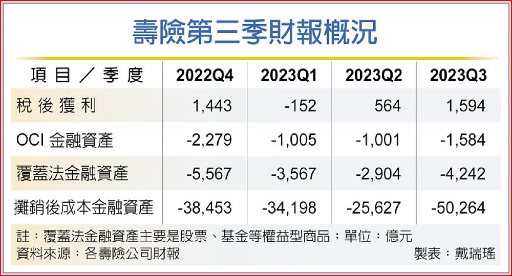 獲利雖較第二季成長,但因金融資產身價下跌,壽險9月底綜合損益是3,699億元,比第二季的4,554億元減少18%,即反應淨值下的身家縮水。