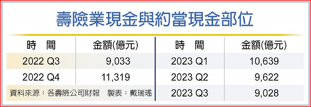 美國聯準會去年大幅升息,新台幣又急速從27元貶至32元,造成去年下半年美元保單解約大增,且避險部位結算需繳大額現金保證金,壽險帳上現金一度吃緊,去年第三季壽險業現金部位降低到9,033億元,水位至少為五年來最低。