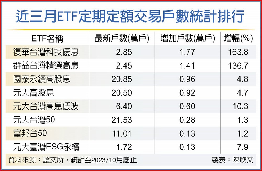 另外,證交所統計,0050、00878、0056國民ETF三劍客,10月定期定額交易戶數同步站上20萬戶;在小資族最愛定期定額的前20大ETF,合計交易戶數首度站上100萬戶,比散戶最愛的前20大個股,交易戶數僅30.62萬多戶,多出二倍多,其中近三個月增加戶數最多前五名皆是配息型ETF,即行情回檔時成為存股族逢低加碼最愛。。