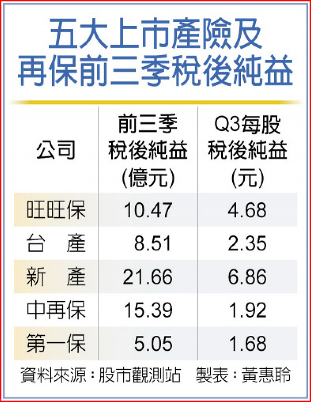 五大上市產險司目前已公布前三季獲利及每股盈餘,其中獲利金額排序,新光產險前三季獲利21.66億元最高,其次是中再保的15.39億元,不過,因中再保資本額已從60億元提高至80億元,每股盈餘被稀釋;排名第三則是旺旺保,前三季稅後盈餘逾10億元,來到10.47億元;台產及第一保前三季稅後盈餘分別是8.51億元、5.05億元。