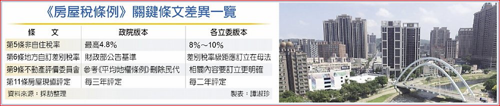 至於立委版本的第11條,政院版本並沒有修正此條文,主要是在野黨團要求,房屋標準單價重新評定的時間,應該從三年調整為二年,但是財政部認為,房屋現值評定較公告地價重新評定複雜,希望可以保持三年評定一次。