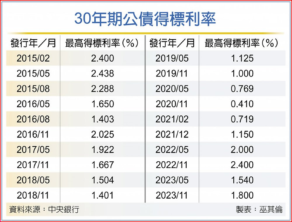 據央行公布,本期30年債標售結果,僅吸引286億元資金進場,相較5月同天期的513.5億元近乎「腰斬」,投標倍數更降至1.14倍,金融業者對市場利率環境保守以對,最高得標利率因而上升至1.8%。