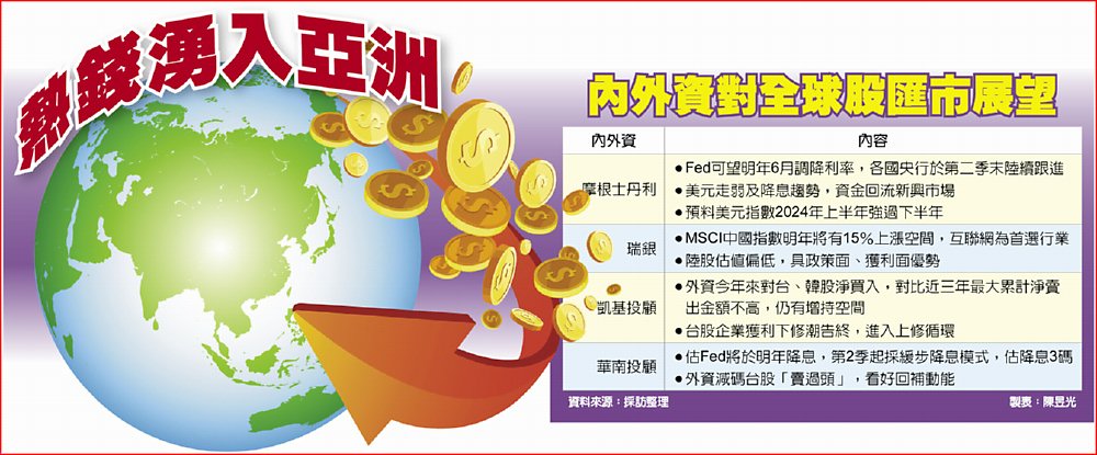 摩根士丹利證券指出,展望2024年,在「經濟成長放緩」、「通膨下降」及「最終寬鬆政策」的基本預期,美國Fed可望於明年6月下調基準利率,各國央行於第二季末、第三季初開始跟進降息,預料印度、印尼央行可能率先降息;美元疲軟與美利率下降趨勢,可能促使資金回流新興市場資產到明年年中。