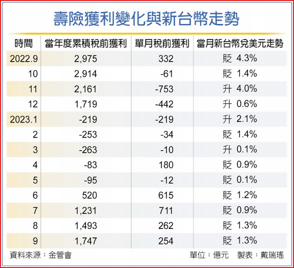 新台幣兌美元從4月起連貶七個月、近1.7元,壽險業亦有大量匯兌利益支撐獲利,4月到9月若未避險匯兌利益高達新台幣7,689億元,因台美利差大,致避險成本高,壽險每月支付避險工具成本高達300億元,在新台幣連貶出現鉅額匯兌利益下,壽險業6月到9月共有580億元淨外匯利益,稅前獲利也在6月開始轉正,前九月達1,747億元,超過去年全年獲利。