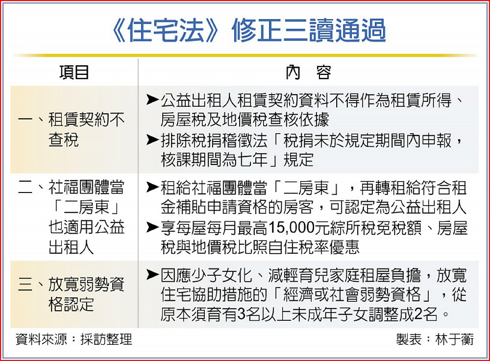 此外,這次修法還增訂房東若將房屋出租給社會福利團體當「二房東」,再由社福團體轉租給符合租金補貼申請資格的房客或弱勢時,也可認定為公益出租人,並享有每屋每月最高1萬5,000元的綜所稅免稅額,房屋稅與地價稅也可比照自住稅率優惠。