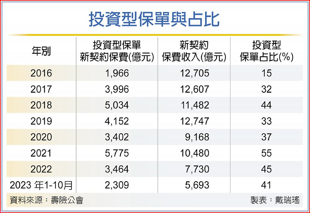 2016年因股災,當年投資型保單新契約保費僅賣出1,966億元,但之後連續六年,每年投資型保單新契約保費收入都在3,000億元之上,2018年、2021年甚至熱賣超過5,000億元,尤其2021年大賣5,775億元、創史上新高,今年預估賣不到3,000億元,終結連六年在3,000億元之上的態勢。