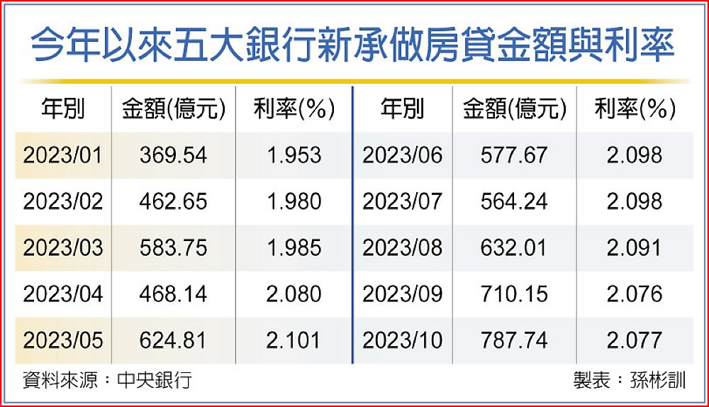 據央行公布的台銀、土銀、合庫銀、一銀、華銀等五大銀行新增房貸統計,新承作房貸自8月來每月攀升,8月新增632.01億元、9月新增710.15億元、10月新增787.74億元;五大銀行合計承做房貸比重,約占全體銀行近四成,一向被視為房市風向球。