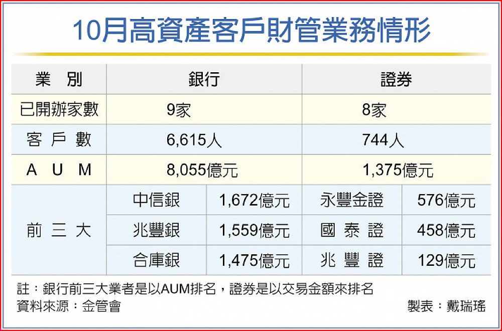 金管會在2020年推出財管2.0方案,開放銀行申請資產超過億元高資產客戶財管業務,至今年10月底已開辦包含中信、兆豐、上海、國泰世華、第一、合庫、瑞士銀行台北分行、玉山、台北富邦等銀行,8月底也核准元大銀行、預計明年第一季開業,10月底再核准華南銀行、預計明年上半年開業,家數增為11家。