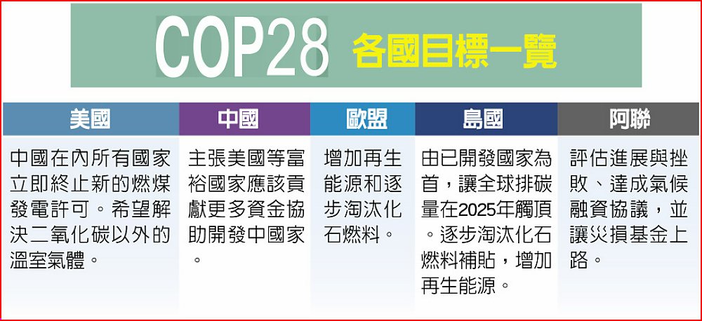 中國是全球最大的溫室氣體排放國,持續主張美國等富裕國家應該貢獻更多資金協助開發中國家。至於歐盟對本屆COP28則設定兩大目標:增加再生能源和逐步淘汰化石燃料。
