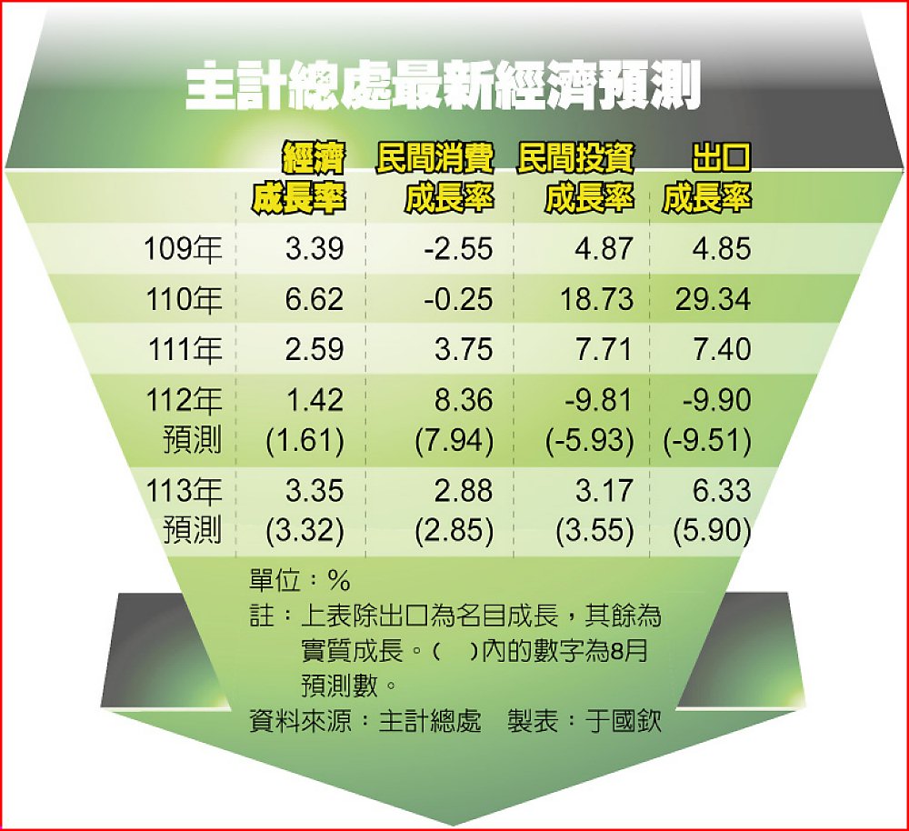 雖然外貿、投資不如原預測,但隨著就業市場持續改善,跨境旅遊增溫,消費動能釋放,主計總處上修今年民間消費成長至8.36%,上修0.42個百分點。綜合貿易、投資及消費最新資料,將今年經濟成長率由8月預測的1.61%下修至1.42%,創近14年最低,即金融海嘯以來的最低。
