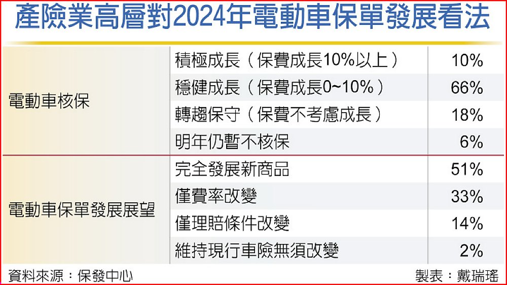 疫後車市旺,不僅一般車種銷售不斷創高,電動車的接受度亦增高,新車即會帶動車險市場成長,對於承保電動車車險,有76%產險高層認為明年會成長,其中有10%會積極核保,估電動車保單將成長10%以上,有66%認為是10%以內的穩健成長,但也有18%認為不會成長,另有6%表示明年暫不考慮核保。