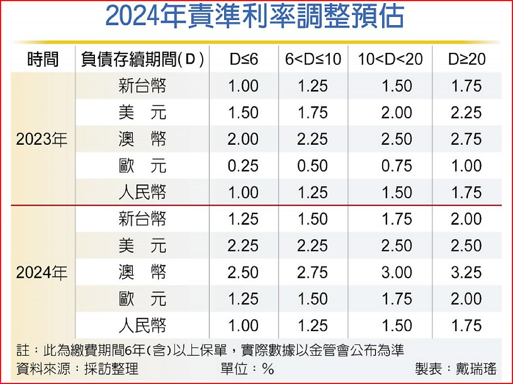 依保單責準金公式試算,明年新台幣保單應調升2碼,長年期保單可拉高到2.25%,即與今年美元保單一致,但前幾年保險局有調整係數,將原本不讓調升的新台幣責準利率額外調升,因此保發中心建議,依照公式估算,新台幣保單調升1碼,長年期保單從1.75%拉高到2%。