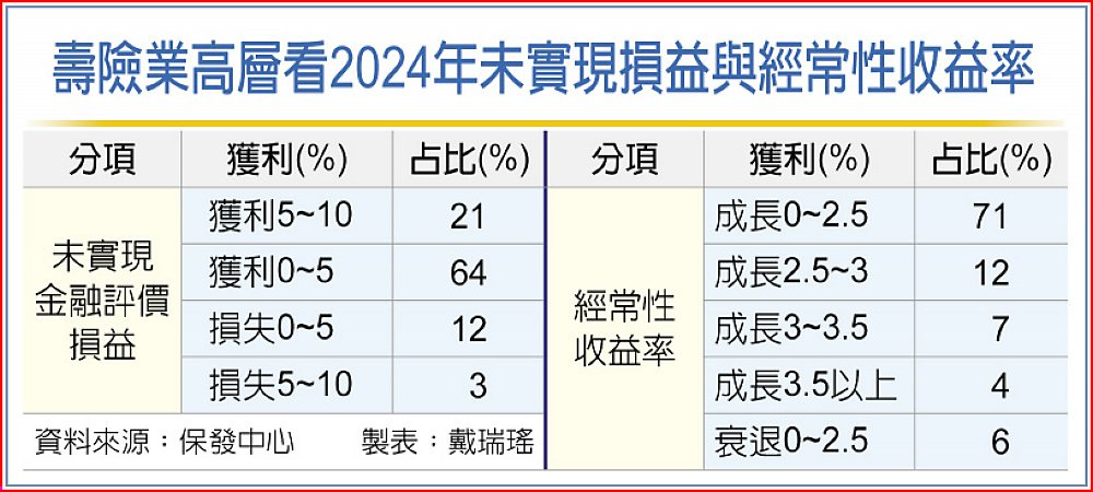 調查指出,85%壽險業高階主管認為,明年股債部位可轉為未實現獲利,21%認為會轉為獲利5%~10%,也有64%認為未實現獲利可有5%以內;認為會持續呈現未實現損失的僅有15%。且預估明年經常性收益率有望提高,高達94%預期會提升,其中11%認為會成長3%以上,12%認為成長2.5%~3%,絕大部分的71%認為成長2.5%以內。