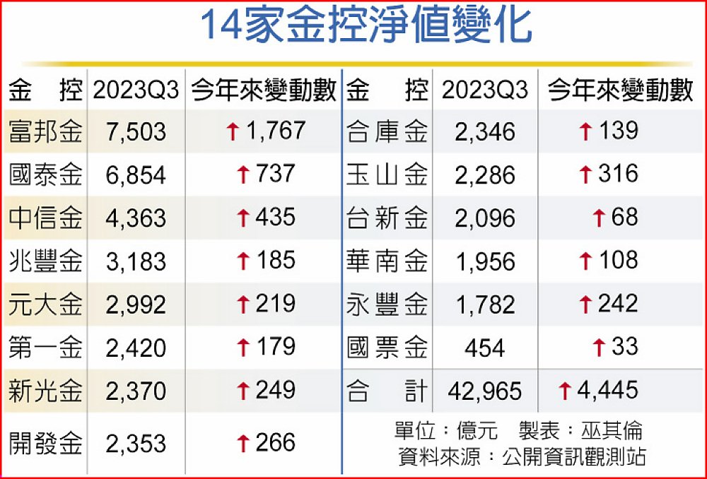 14家金控第三季底淨值較去年底的3兆8,521億元增加4,445億元,較去年同期3兆3,038億元大增9,926億元。淨值最高仍為富邦金的7,503億元,今年回升近1,768億元,是所有金控最多;次高為國泰金的6,854億元。