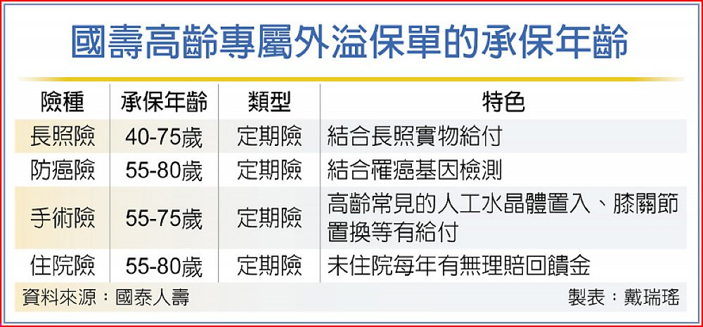 國壽針對高齡者推出的外溢保單包含長照險、防癌險、手術險、住院險等,全都是採定期險,讓保費在可負擔範圍,最低承保年齡多在40歲~55歲以上,像長照險最低承保年齡為40歲,防癌險、住院險等最低是55歲,最高承保年齡到75歲~80歲。