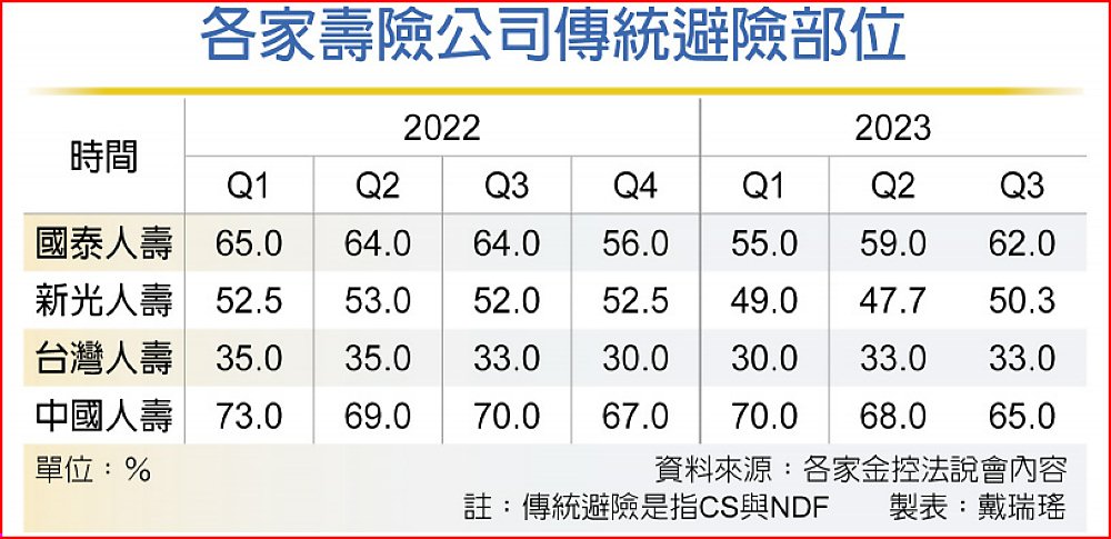 據各公司揭露,9月底CS、NDF等避險比率,新壽、國壽、台壽、南山皆有拉高,國壽今年初傳統避險比率只有55%,到9月底拉高到62%;新壽今年初還只有49%,第二季更下降到47%,但到9月底已拉高超過50%;台壽今年初傳統避險比率約30%,到9月底已提高到33%。