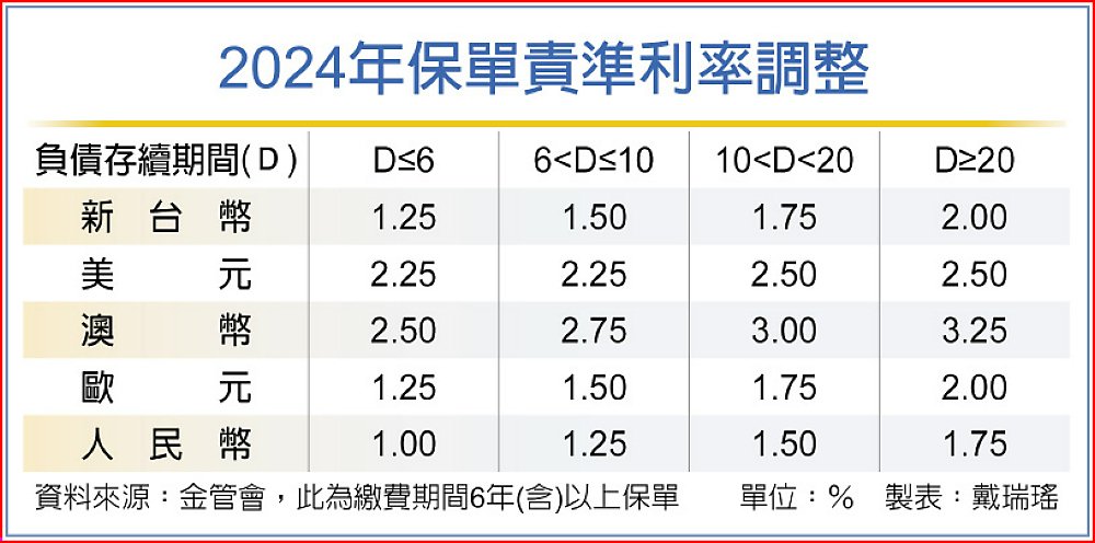 美元保單也將升息,原先保發中心建議全數升息3碼,但在業者有爭議下,最終存續期六年以下美元保單升3碼最多,責準利率從1.5%提高到2.25%,20年期以內的則調升2碼,6到10年期由1.75%拉上2.25%,10年至20年期從2%提高到2.5%,20年期以上美元保單則僅調升1碼,從2.25%調升到2.5%。