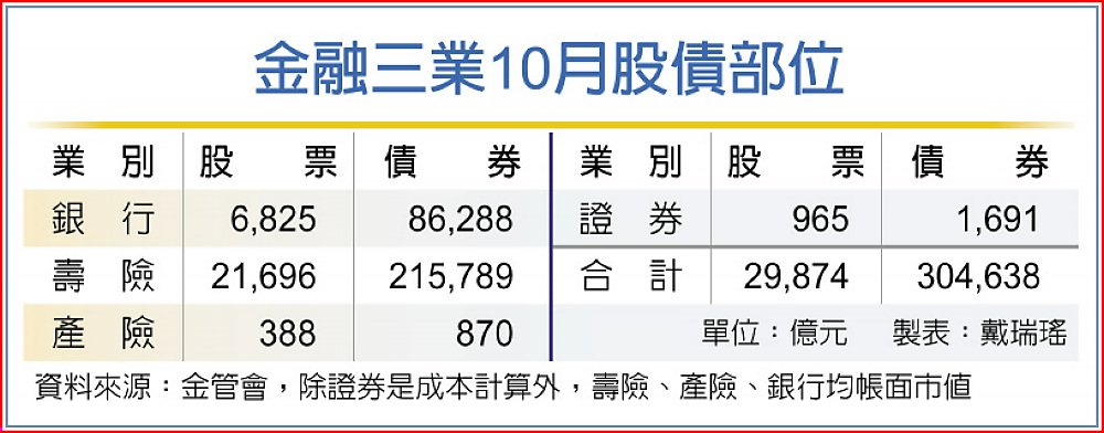 10月因台股大跌,金融三業持股帳面價值跌破3兆元至2兆9,874億元,前十月市值增2,705億元或10%,在台股從9月減碼380億元,10月轉加碼135億元,前十月累積減碼232億元。