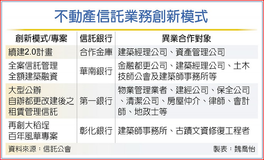 另外,一銀則針對都更後的大型公辦、自辦建案,創新推出「不動產租賃信託管理」服務,使新建物能更有效率長期穩定經營租金收益。