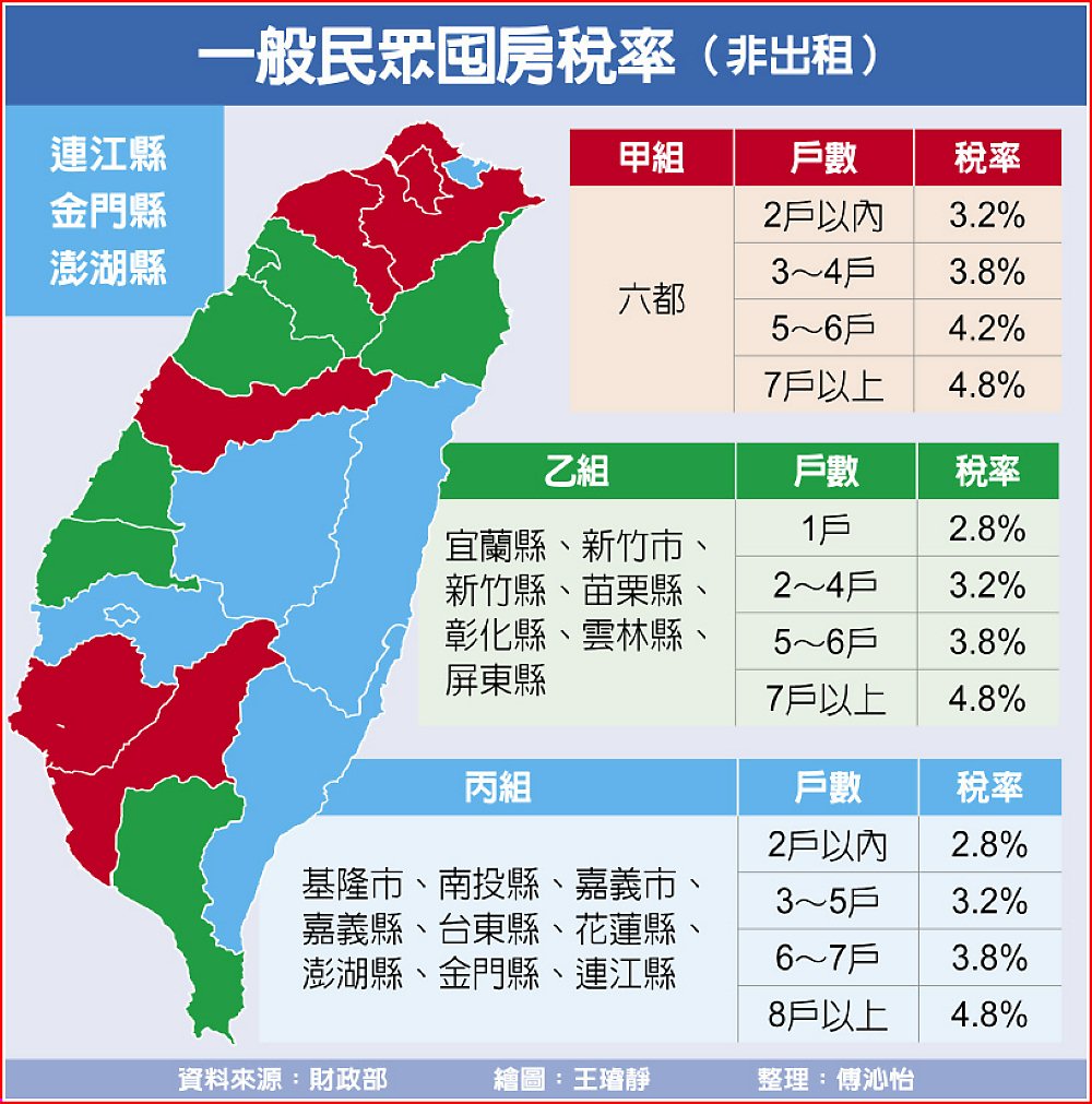 這意味著,一般民眾囤房部分,全台將分為三大區塊,其中房價最高、炒房情況也較嚴重的六都,稅率3.2%~4.8%;第二組竹苗等七縣市,稅率2.8%~4.8%;第三組是基隆等五縣市和離島,稅率2.8%~4.8%,但八戶以上才適用最高稅率。