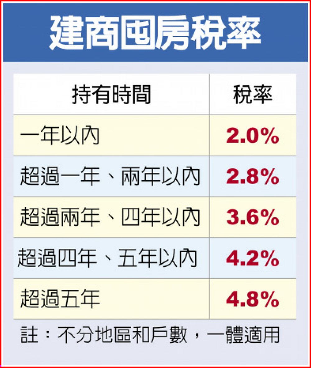 依財政部草擬的課徵參考基準,建商餘屋並非依持有戶數或城鄉區位分級,而是全國「一體適用」,以持有期間為分級課稅基準,持有1年以內稅率2%,1~2年2.8%,2~4年3.6%,4~5年4.2%,5年以上則是4.8%。