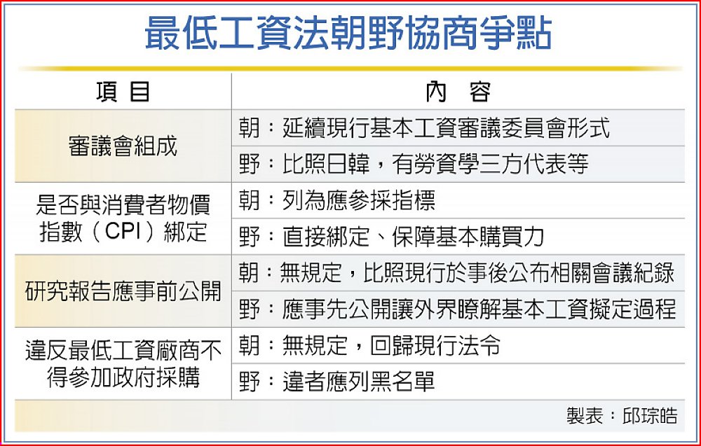 立院日前初審時,將審議委員的組成、參採指標、公開研究報告、以及未來違反最低工資法的廠商是否應列政府採購黑名單等四大爭議條文保留朝野協商,並依政院版完成初審。
