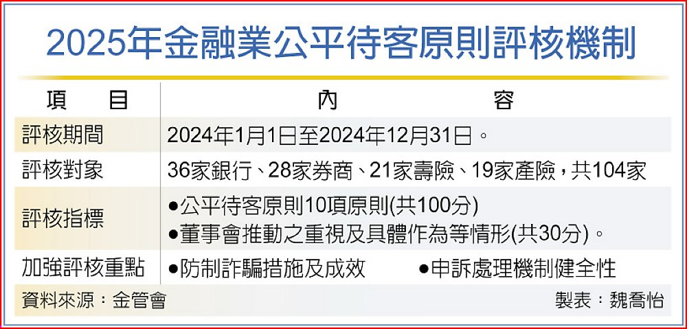 2025年公平待客原則評核期間為2024年1月1日至12月31日,總計有104家金融業受評,包括36家銀行(含三家純網銀)、28家綜合券商、21家壽險及19家產險。評核結果,金管會將維持分二級距公布前段班業者名單,第一級距為前25%,第二級距為前25%至50%;為鼓勵金融業強化公平待客,金管會亦將維持頒發最佳進步獎給較前次評核進步、對公平待客有具體作為的業者。