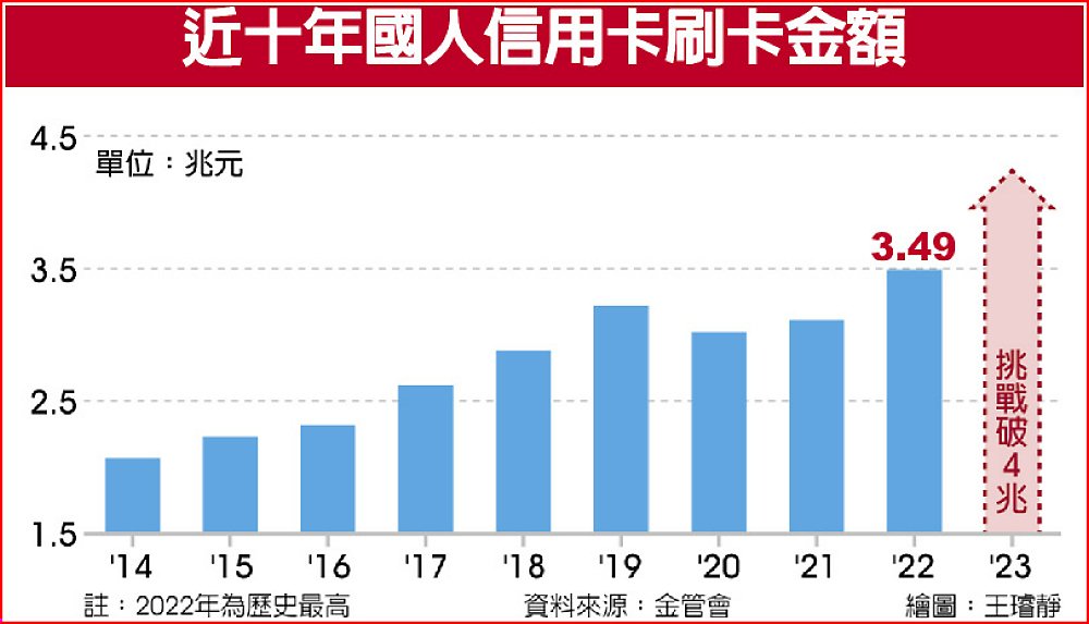 去年第四季起國境開始解封,加上年底消費檔期帶旺,33家發卡行去年強拉尾盤,全年合計刷出3.49兆元,簽帳金額創下史上新高,年增率高達12.3%。今年國人刷卡量更狂,簽帳規模月月攀新高,目前統計至前十月,已刷逾3.47兆元,距刷出史上高點3.49兆元僅差距200億元。